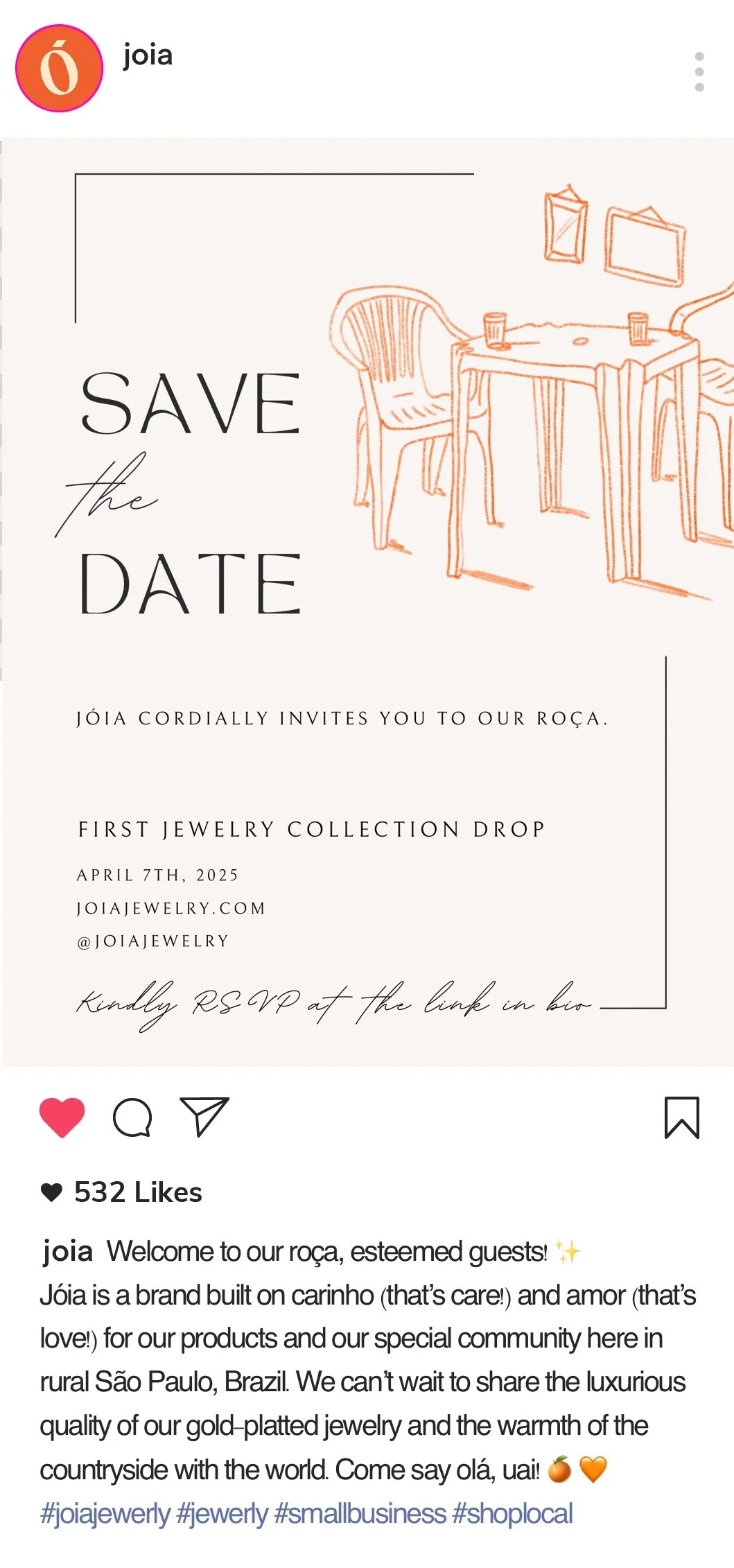 Objective: Within the first two weeks of launch, grow Jóia’s combined Instagram and TikTok following to 5,000+, and generate 500,000 total impressions across both platforms through an integrated marketing campaign focused on brand storytelling, influencer partnerships, and creative visual content, while achieving a minimum engagement rate of 5%/post.
